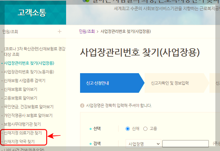 1. 화면 왼쪽의 메뉴 중 붉은색 네모로 표시된 산재지정 의료기관 찾기를 클릭합니다.