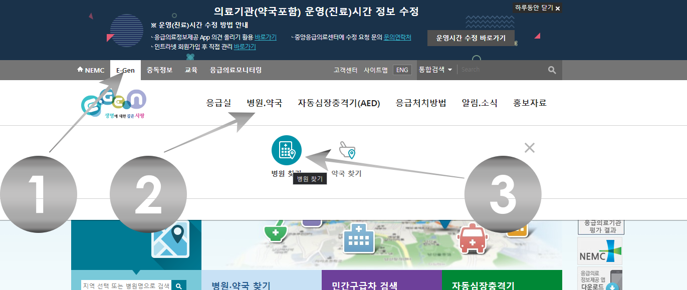 1. 중앙응급의료센터의 사이트 https://www.e-gen.or.kr/ 입장합니다.