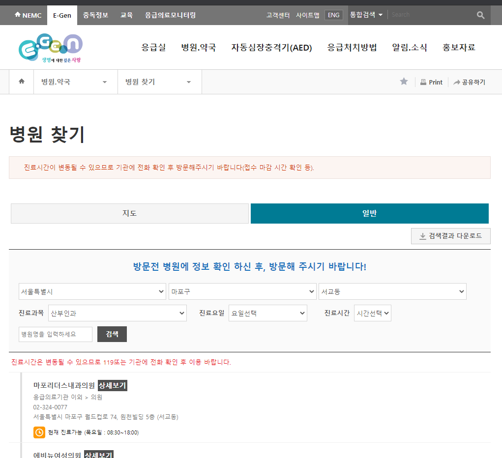 중앙응급의료센터 사이트를 이용한 홍대 산부인과 병원 찾기